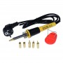Letcon Electric cu 5 Varfuri elSales ELS-LX-M030, Putere 30 W, Suport de metal, Rezistenta ceramica, Tensiune de alimentare 220V - 240V Kit electric cu letcon multifunctional tip creion, ce are 5 varfuri schimbabile si unul fix, acestea sunt ideale pentru lipituri de finete sau lucrari mai ample, atunci cand se fac lipituri cu sarma de staniu (fludor). Detalii Tehnice: Letcon ce poate fi folosit de electricieni, electronisti sau incepatori, pentru a realiza lipituri, pe placi sau cabluri. Acest letcon are rezistenta de ceramica si varf cu pelicula de aliaj special pentru a facilita lipiturile. Tensiune de alimentare: 220V - 240V AC. Frecventa: 50-60Hz. Putere Rezistenta: 30W. Pentru o utilizare de calitate si precisa, va sfatuim sa folositi atunci cand faceti lipituri, pasta decapanta sau sacaz (colofoniu) si fludor de calitate minim SN60/PB40 Inainte de a face lipitura, curatati si eliminati orice urma de murdarie, rugina, praf. Incalziti locul respectiv cu varful Letconului / Pistolului. Aplicati pasta de lipit, colofoniu, sacaz, pentru a degresa locul de lipitura. Apoi se va incalzi inca o data locul sau firele adaugand totodata si fludor. Continut Pachet: 1 x Letcon. 1 x Suport de metal. 5 x Varfuri de alama.